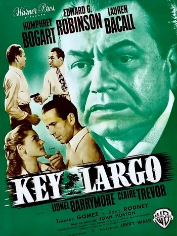Key Largo, 1948, directed by John Huston, starring Humphrey Bogart, Lauren Bacall, Edward G. Robinson, Claire Trevor, Lionel Barrymore, Jay Silverheels, and Monte Blue. Based on the Broadway play of the same name written by Maxwell Anderson. This is a fascinating one. Where many of Bogie’s roles are shiftless, apathetic, and too cool for school, with a bit of the anti-hero thrown in, the role of Frank McCloud casts Bogie as a good guy. A war hero, and a morally upright man not afraid to stand up to a group of gangsters (which is ironic as many of Bogie’s early roles were as gangsters). The head gangster is played by the incomparable Edward G. Robinson. If you’ve ever seen someone do an old school mob boss impression they’re probably doing Edward G. Robinson, for he is the king of this thing (until The Godfather hit the scene anyway.) His performance here is unbelievably good. In fact all the actors in this thing really turn it up. It feels very much like a play (which makes sense as it’s based on one), and puts an array of characters into a small space during a Hurricane. And all hell breaks loose.
